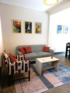 Este apartamento está localizado no piso térreo e dispõe de 2 quartos, uma televisão de ecrã plano e uma cozinha totalmente equipada com frigorífico e micro-ondas.